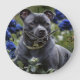 Pictured Among Deep Blue Roses Is A Staffordshire Bull Terrier.