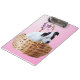 Pictured in a basket is a black and white Staffordshire Bull Terrier Puppy.