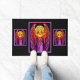 A dramatic stained glass angel, in vibrant jewel colors with a golden halo, announcing the advent of Christmas.