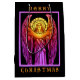 A dramatic stained glass angel, in vibrant jewel colours with a golden halo, announcing the advent of Christmas.
