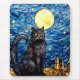 Reminiscent of Vincent Van Gogh's Starry Night, this black cat relaxes against a starry night cityscape.