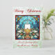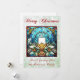 Bright and vibrant stained glass design of a bouquet of Christmas holly and berries surrounding a candle, in a red frame. With pale green glitter background and "Merry Christmas". You can change the customisable personal greeting at the bottom of the design to your own message.