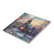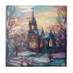 A charming ceramic tile with an image of a winter church in stained glass style.
