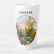 Stylish latte mug features an AI generated desert landscape in the look of stained glass with cacti and mountains. Personalise with name or monogram