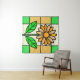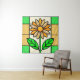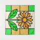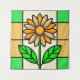 a stained glass window illustration of a yellow and white daisy with green leaves.