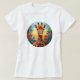 The unique t-shirt design features a round AI-generated giraffe portrait in stained glass.