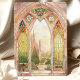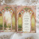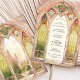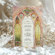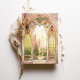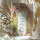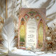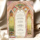 This stunning stained glass-inspired wedding invitation evokes the grandeur of Gothic cathedrals with its intricate arches and vibrant panes of colour. The design features luminous greens, golds, and pinks with delicate floral and ornamental accents. The majestic windows frame a serene countryside landscape, setting a romantic and timeless tone. The back complements the design with a cohesive stained-glass motif, perfect for church or cathedral weddings, or couples looking for a unique, artistic touch. This invitation captures the essence of elegance and spirituality, creating a cherished keepsake for your special day.