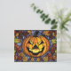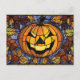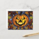 Stained Glass Halloween Pumpkin and Autumn Leaves Holiday Postcard