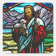 Beautiful stained glass image of Jesus and lambs from stained glass window in St. Mary in the Mountains catholic church in Virginia, Nevada.