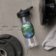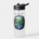 Beautiful water bottle features an AI generated round jungle river in stained glass style. "Save or trees" text is customisable
