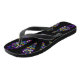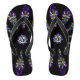 A lovely stained glass pattern adorns these flip flops in dominant colours of purple, blue, yellow and black. Abstract feathers circle a central mask to form a spiritual mandala design with a Native American sensibility.