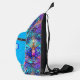 This brightly coloured stained glass drawstring bag is done in a vibrant stained glass pattern in dark blue, turquoise, light pink, dark pink and purple. The front pocket is turquoise blue and has a template for you to enter your own name in a royal blue script. Truly a unique and fun bag that is perfect for quick trips to the market, the book store or whenever you need a bag larger than your purse. Great for backpacking too to carry some water bottles and snacks.