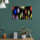 This eyecatching and colourful poster print features an abstract digital painting of the glowing stained glass windows of a church filled with warm light. The colours include flashes of brightneon red, yellow and blue.