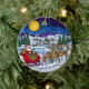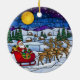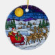This delightful round ceramic ornament captures the magic of Christmas Eve, rendered in a beautiful stained glass style. The scene features Santa Claus on his bright red sleigh, pulled by a team of Reindeer, soaring over a snowy, peaceful village landscape under a giant golden moon and a dark, starry night sky. This unique piece is perfect for adding traditional charm and artistic flair to your tree. It makes a wonderful Christmas keepsake and a thoughtful holiday gift to be cherished for years to come.