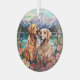 Two beautiful Golden Retriever dogs are the feature on this pretty glass ornament. The dogs are pictured in front of a lake, with flowers and leaves framing them. In the background are majestic snow covered mountains.T his ornament makes a nice stocking stuffer at Christmas, but can be displayed all year long. I like to hang mine in a window that receives plenty of sunshine!
