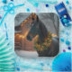 A black horse stands in a snowy landscape adorned with a festive wreath of lights around its neck.