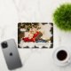 Season's Greetings. Elegant Retro Stamped Floral Frame, Holiday foil photo card. Features, template space for your personal holiday message on back.