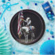 A gorgeous photograph of the cowgirl on a palomino & white Paint Horse holding the American Flag during the National Anthem at the 2014 Snake River Stampede. With a red, white and blue border. Photography and design by Robin D. Cox.