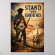 Warm sepia tones, an American-flag silhouette draped over a Revolutionary War soldier, and bold lettering that reads “STAND YOUR GROUND” create a mood of resolve and quiet patriotism. The image feels like a found relic—edges softened, textures layered—so it blends easily into spaces that favor vintage Americana, study nooks, or a den with rustic décor