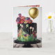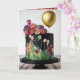Birthday card featuring extravagant chocolate cake with frosting flowers and a golden balloon.