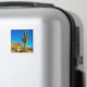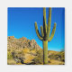 The photograph features a large multi-armed saguaro cactus by a hiking trail which leads towards a boulder strewn mountain in the Sonoran desert.
