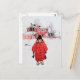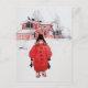 Little Scandinavian girl in red stands in the snow with an old-fashioned farm house in the background. Vintage fine art watercolor by Carl Larsson.