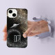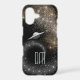 This unique phone case features a swirl of silver and gold stars against a black universe. Coming out of the star swirl is a silver UFO. The star swirl ends at your two letter monogram, which is also in silver. Mysterious and fun!