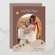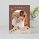 A beautiful holiday card design featuring a vertical photo in an arched layout, set on a desert background dotted with palm trees and tiny houses. The star of Bethlehem shines against the night sky in gold foil, with "O Holy Night" curved across the top. Personalise this elegant religious Christmas card design with your custom holiday greeting, family signature and the year.