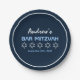 Star of David Pattern Bar Mitzvah paper plate features five star patterns aligned horizontally on a striped background, all within a white circular border. The title 'Bar Mitzvah' and the specific date are in blue. Available for bat mitzvahs as well. © Morning 6