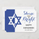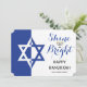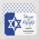 Star of David Shine Bright Hanukkah holiday blue ticket style flat card featuring the Star of David in positive negative space style, the text “Shine bright” and “Happy Hanukkah” ,and the Hanukkah menorah or chanukiah candelabrum in black and yellow. On the back the Star of David forms a pattern.