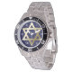Has heft and feel of expensive stainless steel quartz watches. Good band with safety catch. I removed links, which is easy because engraved arrows show direction to push the linking pins. As always by this seller, the image (a railroad logo) is a perfect reproduction of my emailed image, and is precisely spaced and aligned.