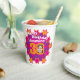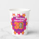 Personalise these bright 30th birthday party paper cups with your own birthday name and photograph in the 0 of 30 on both sides one for your photo now and one from your past. Fun star pattern and text and personalised photo design in bright pink and orange yellow. Ideal for using at a girls thirtieth birthday party. Other matching items are available. © Original graphic art and design by Sarah Trett for www.mylittleeden.com