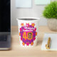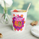 Personalise these bright 40th birthday party paper cups with your own birthday name and photograph in the 0 of 40 on both sides one for your photo now and one from your past. Fun star pattern and text and personalised photo design in bright pink and orange yellow. Ideal for using at a girls fortieth birthday party. Other matching items are available. © Original graphic art and design by Sarah Trett for www.mylittleeden.com
