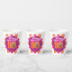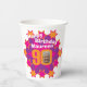 Personalise these bright 90th birthday party paper cups with your own birthday name and photograph in the 0 of 90 on both sides one for your photo now and one from your past. Fun star pattern and text and personalised photo design in bright pink and orange yellow. Ideal for using at a girls ninetieth birthday party. Other matching items are available. © Original graphic art and design by Sarah Trett for www.mylittleeden.com