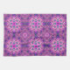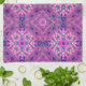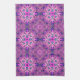 This towel's design reminds me of the 70's. It is a geometric pattern consisting of diamonds, circles, and squares in shades of purple. There are stars interspersed throughout the design.