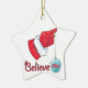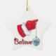 This star shaped whimsical design has a Santa hand with a blue ornament dangling from the end of a string. There is customisable text on the blue ornament for you to add the year. Additional colourful text reads: "Believe". This design makes a great gift for "believers" of any age!