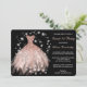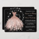 Here's an elegant and beautiful invitation for that all important Sweet 16 Party! It features a shimmery, sparkling dress in shades of rose peach pink surrounded by shiny silver stars. Your custom text is in silver and pale pink at the right side. Everything is placed on a dramatic black background. The back of the invitation is also black, with silver heart tiara and high heeled shoes, again surrounded by silver stars. Gorgeous, as she is!