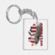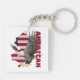 This keychain features a striking graphic design of an eagle in mid-flight with its wings spread wide, superimposed on the silhouette of a map outline of the United States. The background includes an American flag pattern with red and white stripes and a blue field with stars. The word “AMERICAN” is prominently displayed across the design in bold, capital letters. This design symbolises American pride and identity, making it a perfect accessory for those who want to showcase their patriotism.