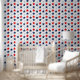 Red, silver and blue big 2 D stars against white wallpaper.