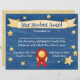 Star Student Award Certificate Award for Pre-school, Pre-K, Kindergarten or any course or program. Add your own title and details to this Customisable Kids school award participation certificate Letter size 8.5"x11". Custom generative ai design with blue night sky, stars, banner, rays of light and red ribbon seal. Great to use for preschool, pre-k, kindergarten, elementary primary school! Show your pride and enthusiasm about the efforts of your students and staff with this customisable, personalised certificate. Add your own text online, and order certificates custom made for your summer camp, extra-curricular activity, math, stem, steam, science, robotics, engineering, or elective program. Leave the signature area blank to add a signature later, or type your name and title, and still add your signature above. Honoree's name can be typed in or the blank line can be left to add hand-written with a black or white marker or printed names later.