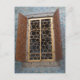 A wooden shuttered window with an ornate grill and blue and white tiles around it.