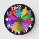 This wall clock has a mid-century modern design of a wreath made up of stars in shades of red, orange, yellow, green, blue, and purple.