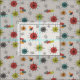 Mid-century modern starburst pattern with rectangles and black abstract lines. Colours are of the time period in red, lime green, grey and teal on a light brown background.