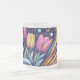 Mystical and elegant, this frosted glass mug mists your morning with the soft glow of moonlit tulips swirling in dreamy midnight hues.