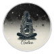 An enchanting silhouette of a woman cradling a glowing crystal ball, symbolising wonder and introspection. The backdrop features a luxurious black-and-gold bokeh with soft, shimmering lights and celestial sparkles, evoking a dreamlike atmosphere.