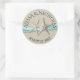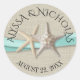 Rustic beach wedding favour sticker with bride and groom's names and wedding date. Aqua ribbon and burlap design with starfish.