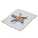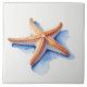 An illustration of an orange starfish on its blue silhouette. Watercolor drawing.
