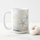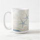 A beach theme design featuring two starfish on a sandy beach with the ocean around it.