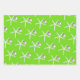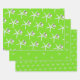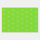 Starfish and ornament pattern Christmas wrapping paper sheets. Bright lime green paper with white sea stars. Each sheet in the set has a different size starfish pattern. Each sea star has a little silver white ornament hanging from one of it’s legs. Perfect for gift giving in a warm climate.