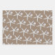 Starfish and ornament pattern Christmas wrapping paper sheets. Sand brown, sea blue, and pale teal green sheets have a pattern of white sea stars and a silver white ornament. Perfect for gift giving in a warm climate.